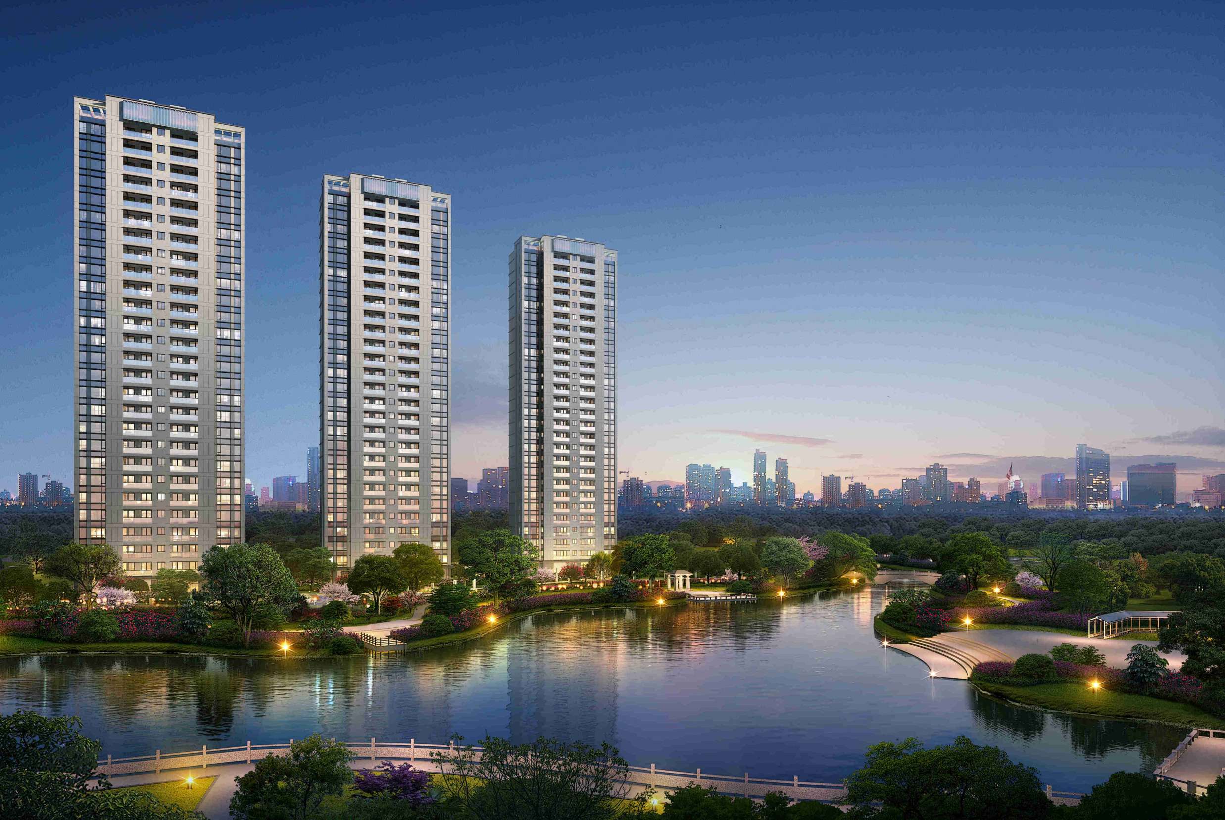 整個項目占地1.13萬方,總建面積約4.99萬方,地上約3.38萬方,地下約1.51萬方。由4幢27層高層圍合而成,其實1號樓是自持,2、3、4號樓采用一字排開的布局,使得公園的景觀資源能滲透進項目內,最大化利用了公園的景觀資源,從來名貴,必居于湖畔。并且,古人云,臨湖而居,盡得財氣。